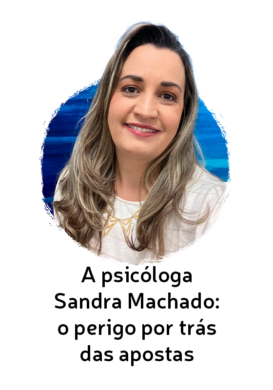 A psicóloga Sandra Machado adverte: “As apostas parecem divertidas, porém, por trás disso, existe um grande perigo. Elas dão a falsa ideia de que é possível ganhar dinheiro fácil, sem esforço, e isso é uma armadilha.”